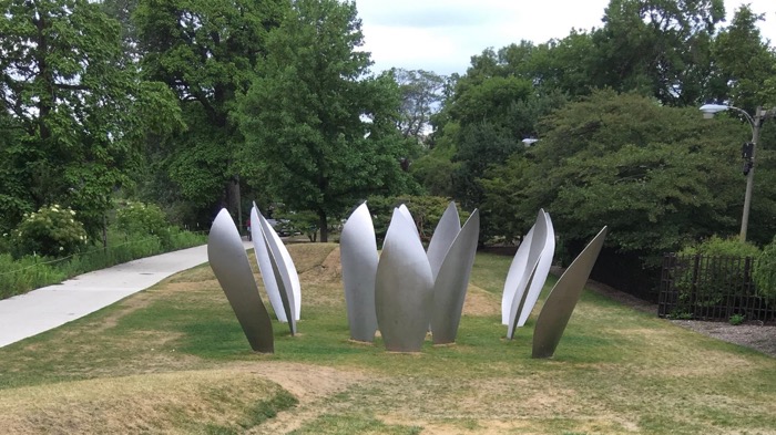 この再開発事業に貢献されたのはアーティストとして活躍するオノ・ヨーコさんです。故ジョン・レノン氏の未亡人で、世界平和・人権運動家としても知られるオノさんは2013年に、シカゴ万博120周年記念に桜が植樹された公園をみて、鳳凰殿が焼け落ちた跡地を癒したいと思われたそうです。3年後の2016年には、オノさんが北米で初めて手がけたパブリックアート「スカイランディング(SKYLANDING)」がジャクソンパークに寄贈されました。