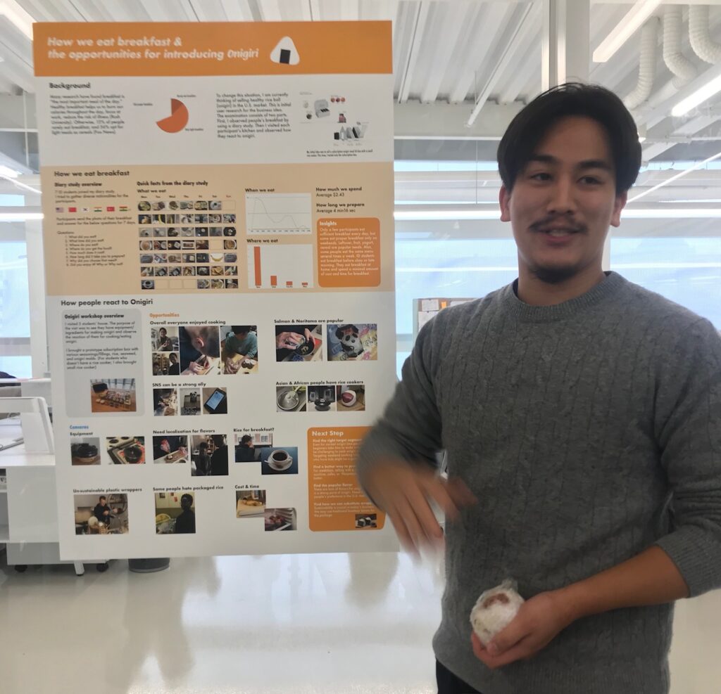 Onigiri was something that often came to mind when he was working hard at his studies and got a little hungry. In Japan, onigiri were always close at hand, especially when he was working overtime, but in Chicago, he could not find them. Katsuyama had no choice but to eat a sandwich from the convenience store for lunch, but it was never satisfying. He recalled, “I wanted to eat a good onigiri!” Motivated to somehow eat onigiri that he missed, Katsuyama designed a triangular rice cooker shaped like an onigiri for a graduate school project. It was well received by his professors and classmates and led to even more new ideas.