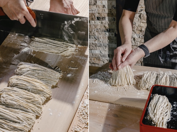 真理子さんの作る蕎麦の配合は、伝統的な「二八そば」で“蕎麦粉8:小麦粉2”。この割合こそが風味や旨みを十分に楽しめ、喉越し良くいただける比率だそうです。蕎麦粉はニューヨークからの特注。以前は日本から調達していたそうですが、イベントに合わせて新鮮な蕎麦粉をニューヨークから送ってもらうことで、アメリカ国内で地産地消が叶い、フレッシュな蕎麦を提供することが可能になりました。蕎麦粉には「ルチン」という成分が含まれており、血管を強くするとともに抗酸化作用があり、アンチエイジング効果があるスーパーフードとして注目を浴びています。江戸時代に流行した「蕎麦屋で酒を飲み、最後は蕎麦で締める」という風習は健康面でも理にかなっているという事でしょう。
